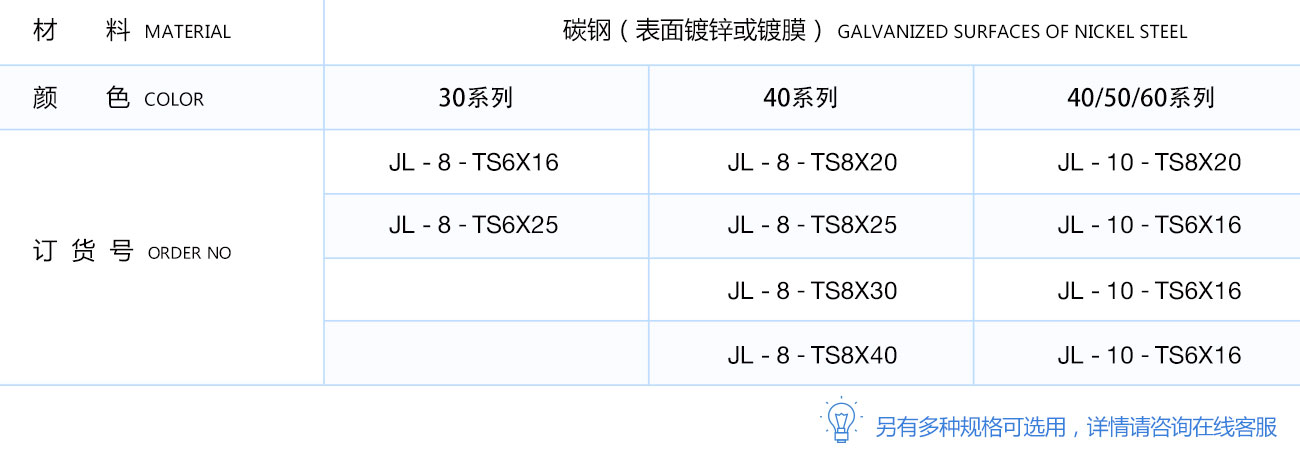 T型螺栓(shuan)直接放入(ru)型材(cai)槽內,安裝過(guo)程中它能自(zi)動定(ding)位鎖緊,常與(yu)法(fa)蘭螺母配合(he)使用(yong),是安裝角(jiao)件等型材(cai)配件的好幫(bang)手。根據不同(tong)型材(cai),槽寬及(ji)按準過(guo)要求可選用(yong)不同(tong)規格(ge)及(ji)長度(du)的T型螺栓(shuan)。