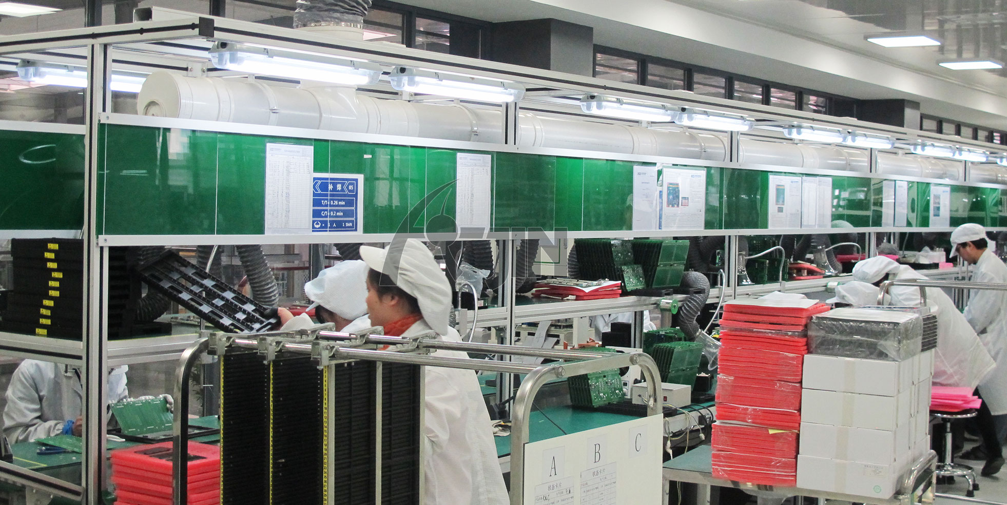生產流(liu)水線(xian)(xian)(xian)是在一定的線(xian)(xian)(xian)路上連續輸(shu)送貨(huo)物搬運(yun)機(ji)(ji)械(xie),又(you)稱輸(shu)送線(xian)(xian)(xian)或者輸(shu)送機(ji)(ji)。按照輸(shu)送系列產品(pin)大(da)體(ti)可以(yi)分(fen)為:皮帶(dai)(dai)流(liu)水線(xian)(xian)(xian)、板鏈線(xian)(xian)(xian)、倍數鏈線(xian)(xian)(xian)、插件(jian)線(xian)(xian)(xian)、網(wang)帶(dai)(dai)線(xian)(xian)(xian)、懸掛線(xian)(xian)(xian)及滾筒流(liu)水線(xian)(xian)(xian)這(zhe)七類(lei)流(liu)水線(xian)(xian)(xian)。一般包括牽引件(jian)、承(cheng)載(zai)構件(jian)、驅動裝(zhuang)置(zhi)(zhi)、張(zhang)緊(jin)裝(zhuang)置(zhi)(zhi)、改(gai)向裝(zhuang)置(zhi)(zhi)和支(zhi)承(cheng)件(jian)等。流(liu)水線(xian)(xian)(xian)輸(shu)送能力大(da),運(yun)距長,還可在輸(shu)送過程(cheng)中同時(shi)完(wan)成若(ruo)干工藝操(cao)作,所以(yi)應用(yong)十分(fen)廣泛,使用(yong)我公(gong)司(si)生產的各種(zhong)生產流(liu)水線(xian)(xian)(xian)可以(yi)為客戶(hu)大(da)幅節(jie)約人工、提升效(xiao)率!