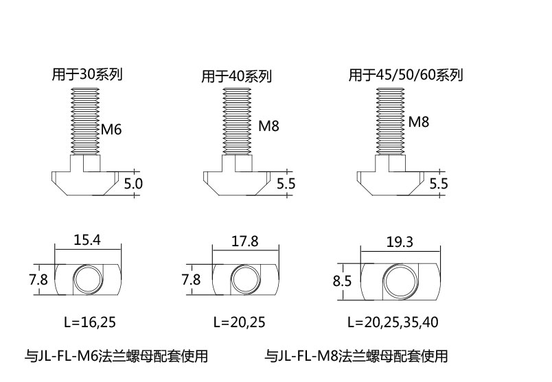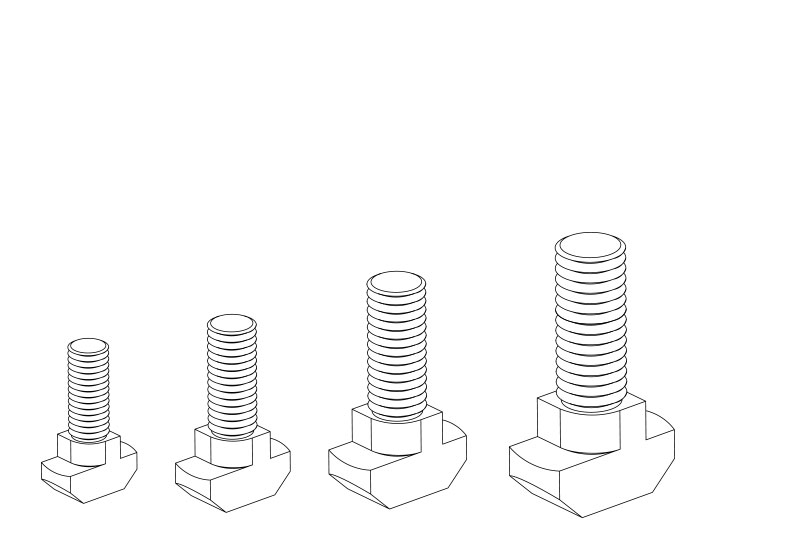 T型螺栓(shuan)直接放入(ru)型材(cai)槽內,安裝過(guo)程中它能自(zi)動定(ding)位鎖緊,常與(yu)法(fa)蘭螺母配合(he)使用(yong),是安裝角(jiao)件等型材(cai)配件的好幫(bang)手。根據不同(tong)型材(cai),槽寬及(ji)按準過(guo)要求可選用(yong)不同(tong)規格(ge)及(ji)長度(du)的T型螺栓(shuan)。